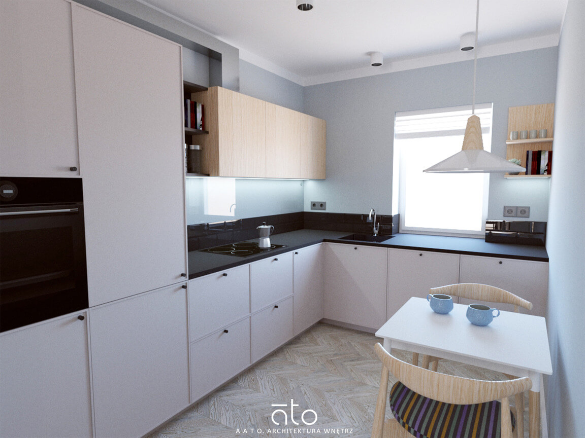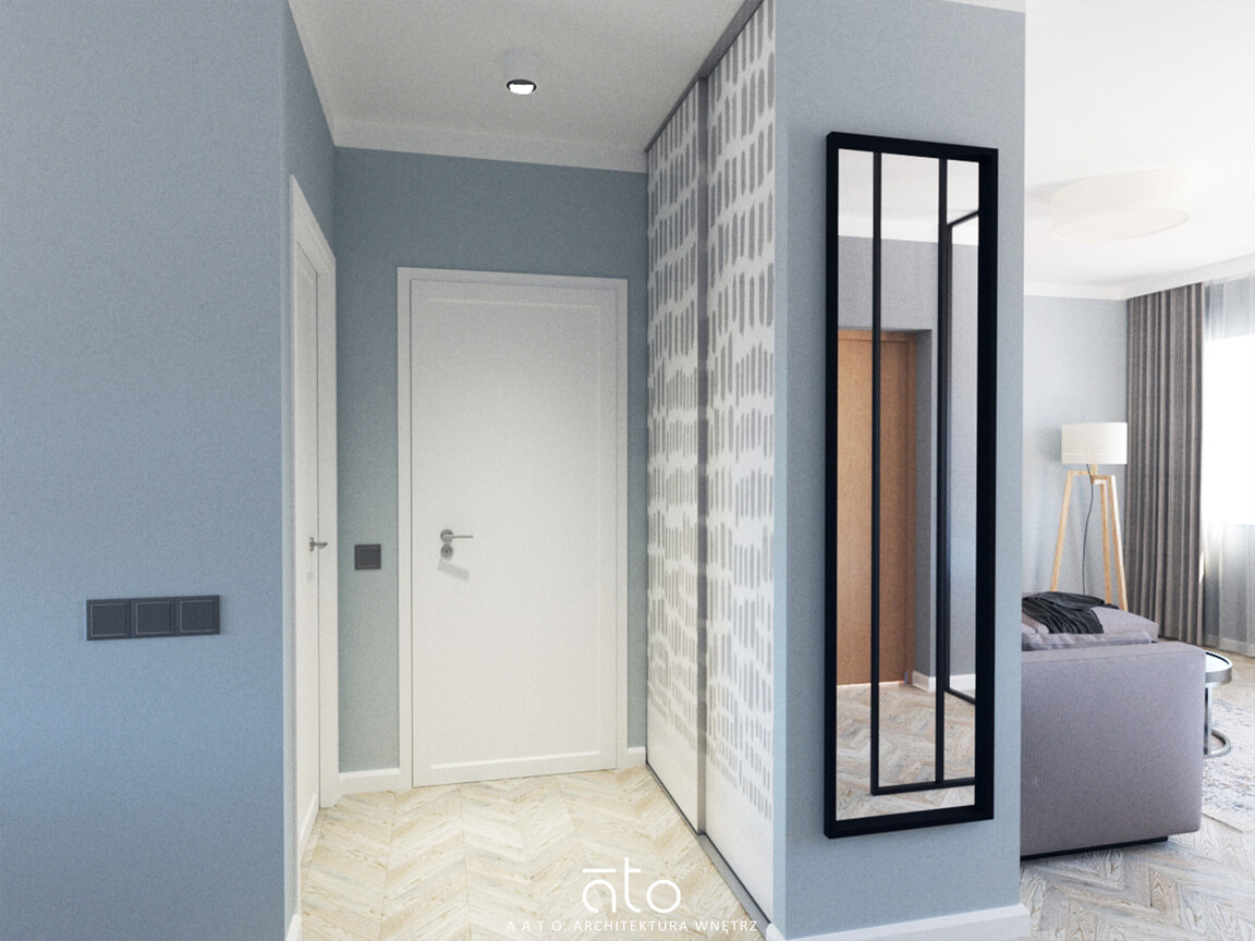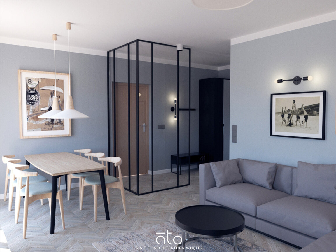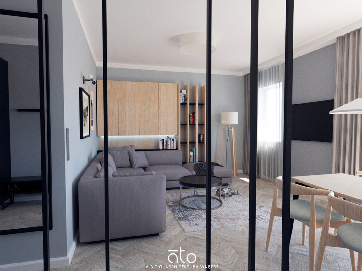 Mieszkanie jakich jest już mało. Przestronne, z oddzielną kuchnią i oknami na dwie przeciwległe strony budynku umożliwiające wietrzenie na przestrzał. Całkiem niezły układ deweloperski mieszkania nie wydzielał niestety części wejściowej. Żeby delikatnie oddzielić przestrzeń, nie tracąc przy tym przestrzenności, dodana została na przeciwko drzwi wejściowych ścianka szklana w metalowych ramach. W mieszkaniu dominuje jasne, ciepłe drewno i pastelowe kolory ścian i mebli.