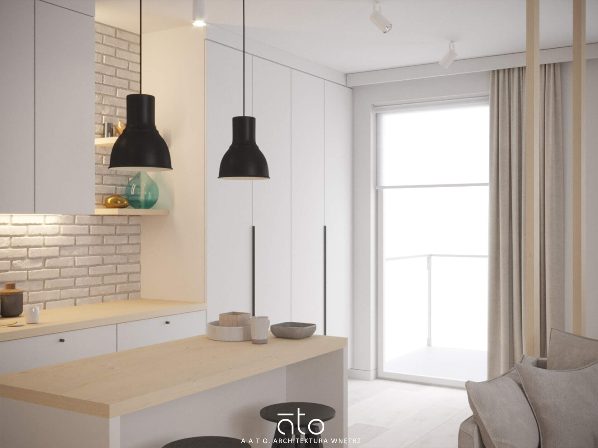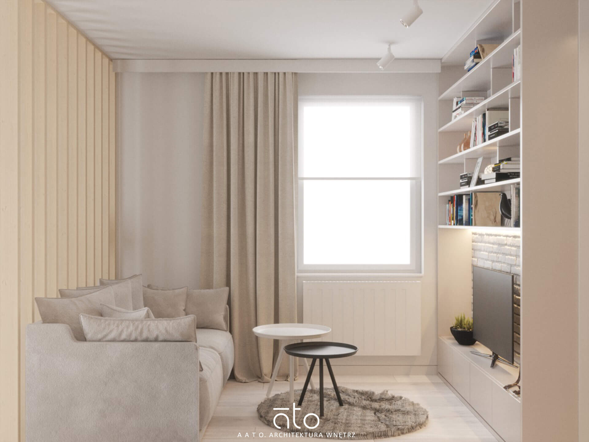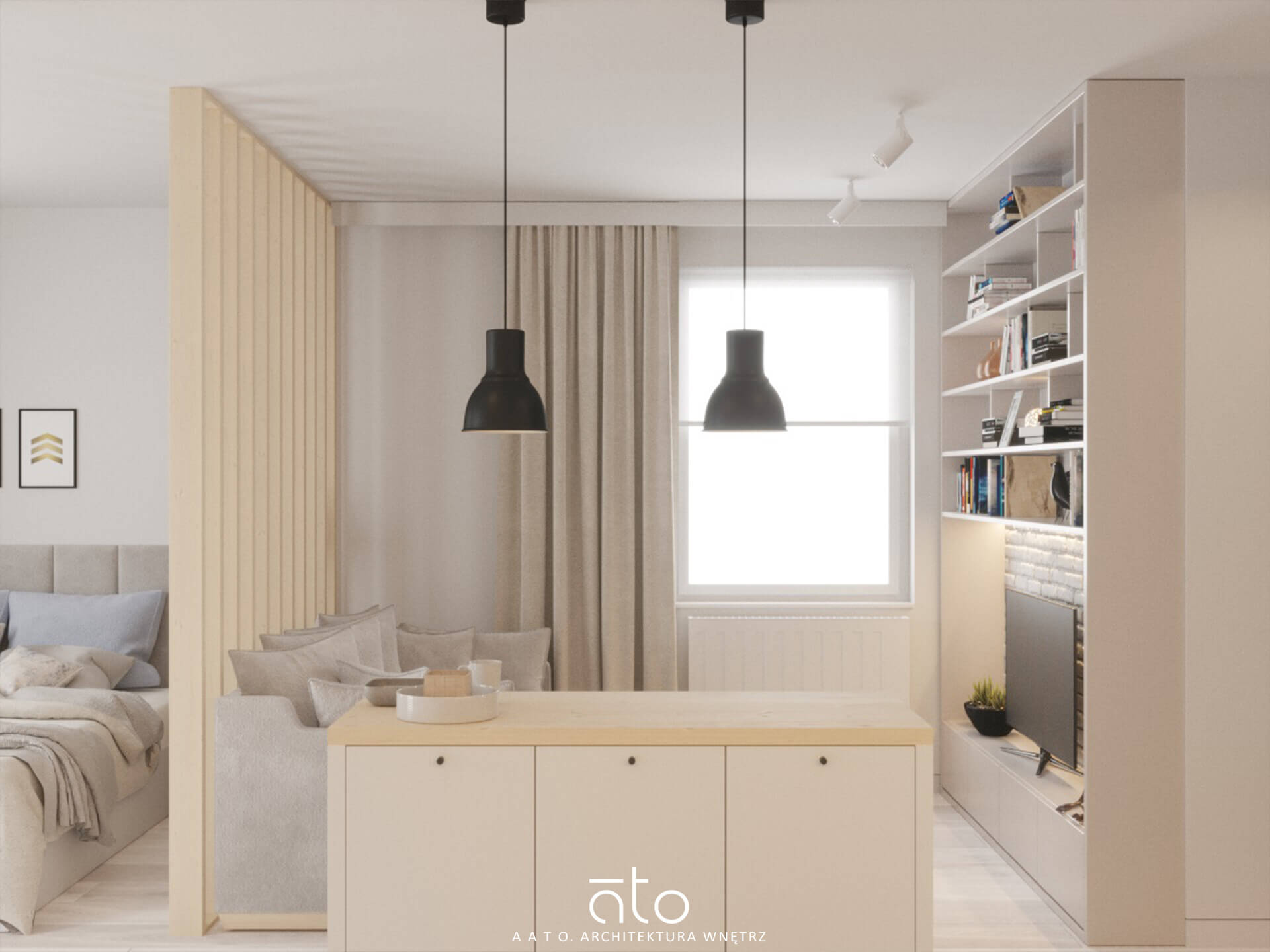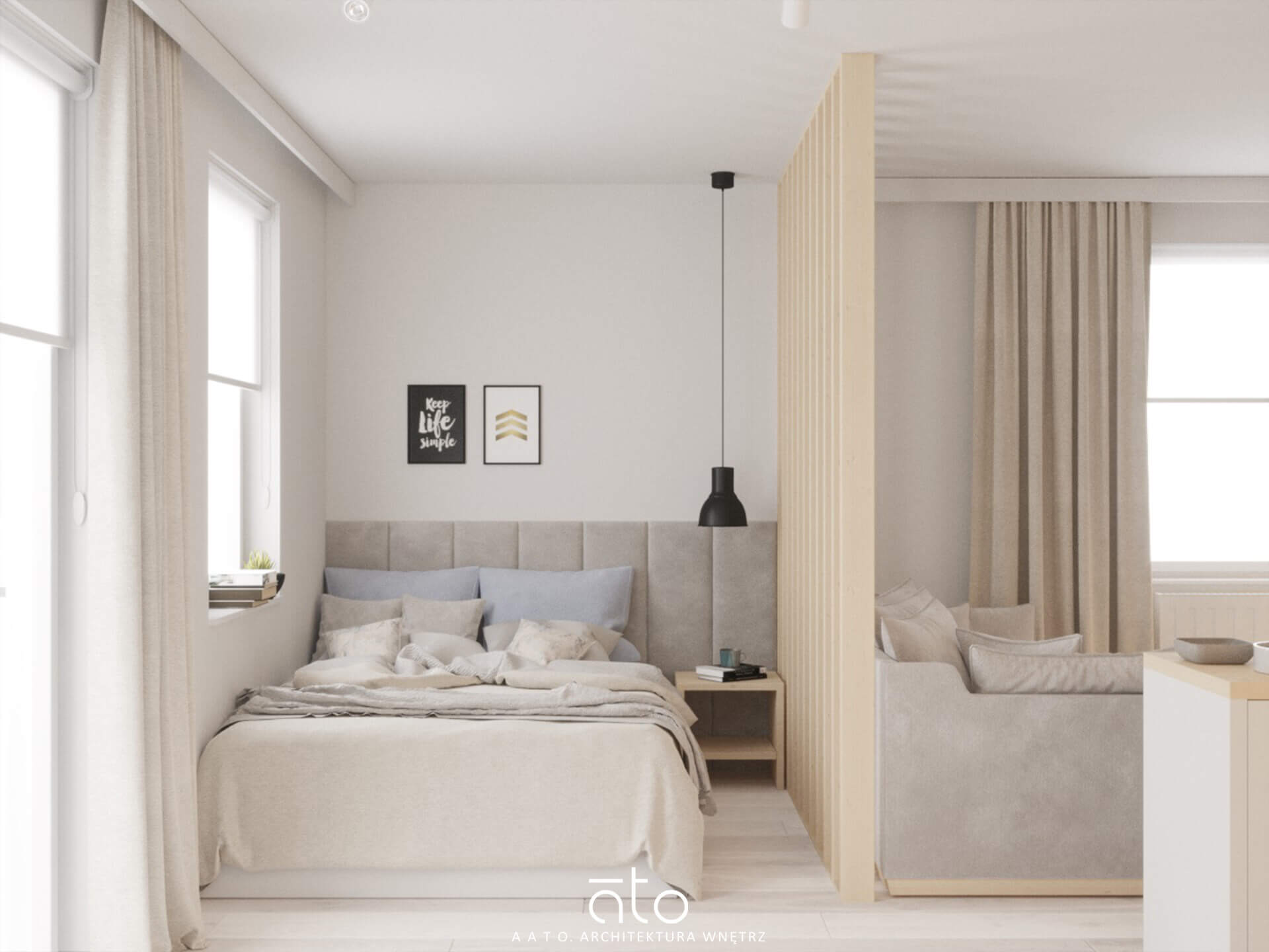 Projektując małe mieszkania zawsze staram się wydzielić oddzielną strefę sypialni. Udało się to również w tym 30- metrowym mieszkaniu na wynajem. Dodając do tego jasne kolory, złamaną biel, beż, jasne szarości i bielone drewno, otrzymaliśmy przytulne i komfortowe mieszkanie.
