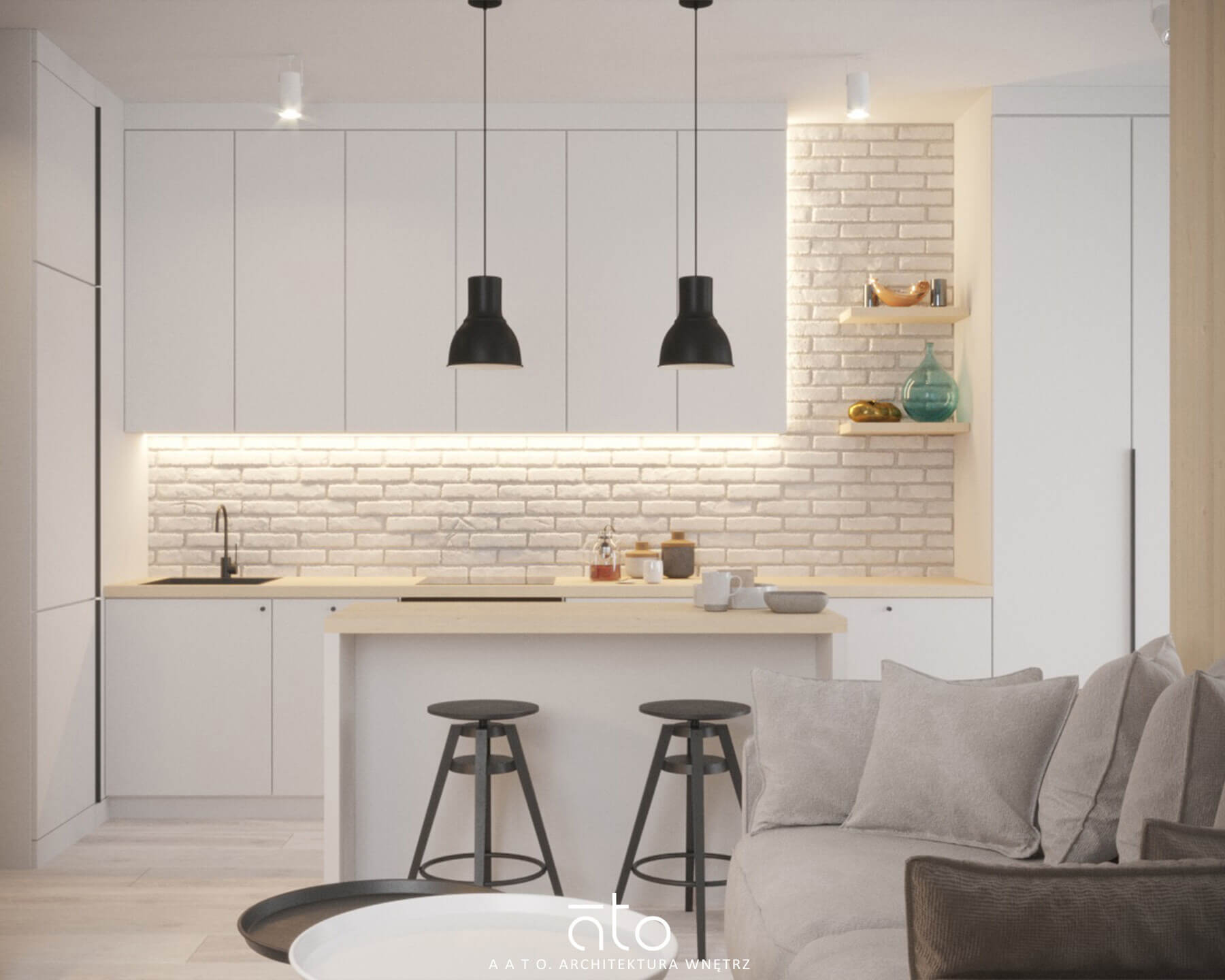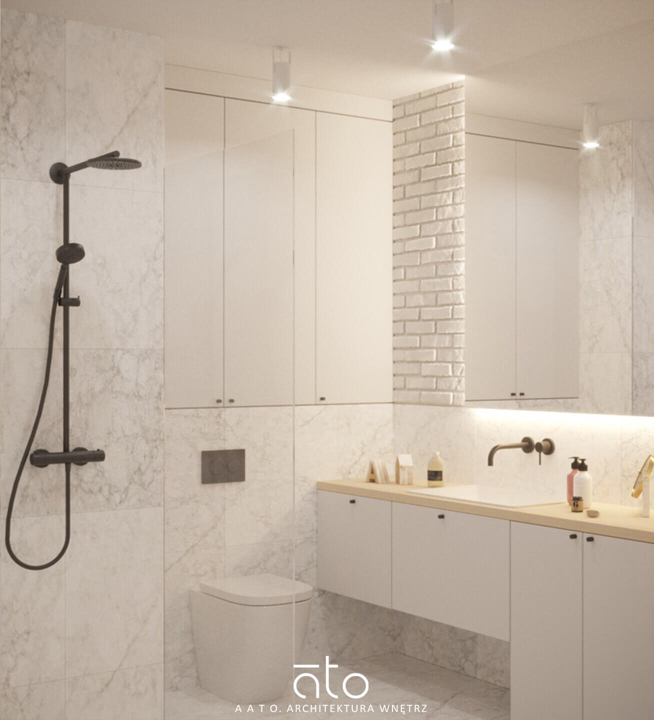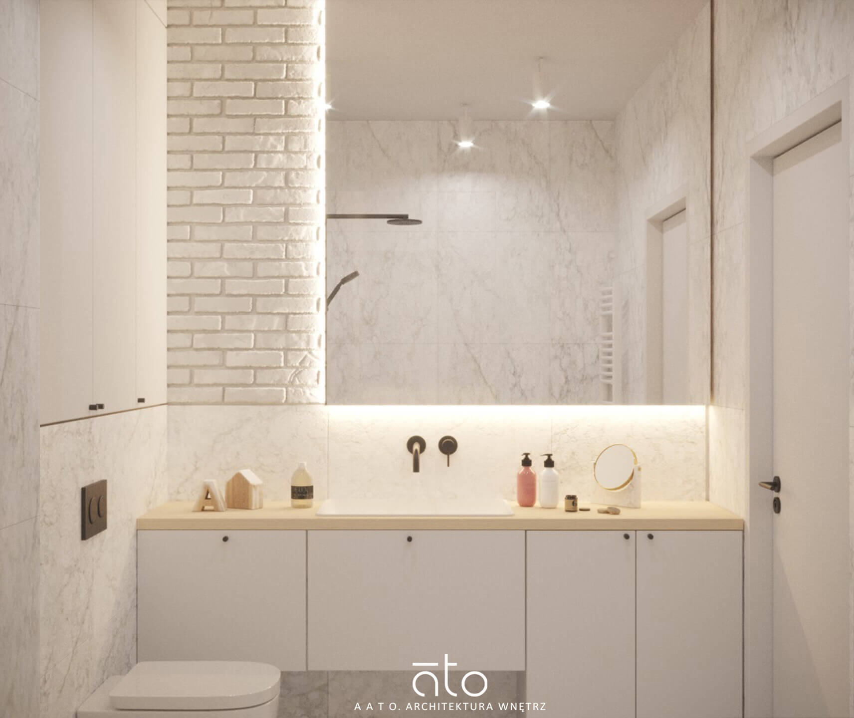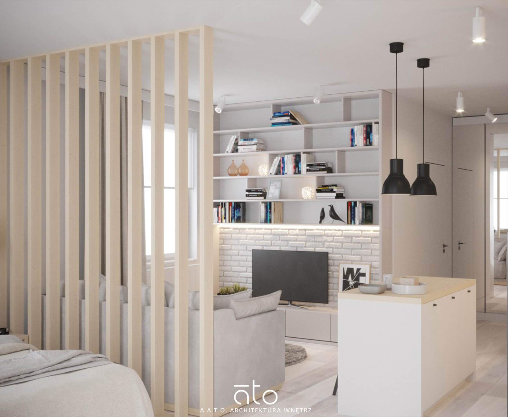 Projektując małe mieszkania zawsze staram się wydzielić oddzielną strefę sypialni. Udało się to również w tym 30- metrowym mieszkaniu na wynajem. Dodając do tego jasne kolory, złamaną biel, beż, jasne szarości i bielone drewno, otrzymaliśmy przytulne i komfortowe mieszkanie.