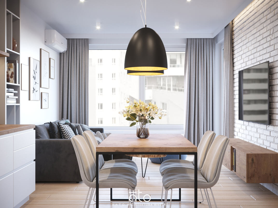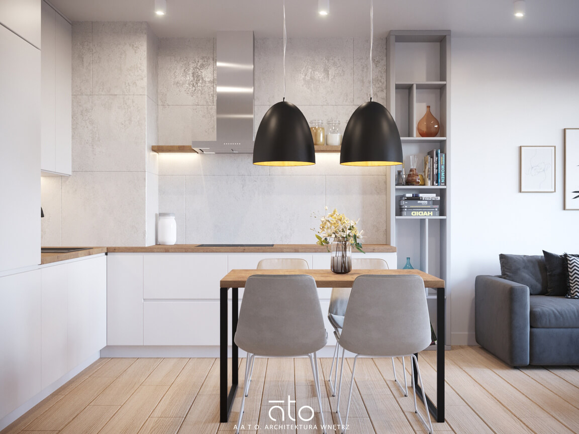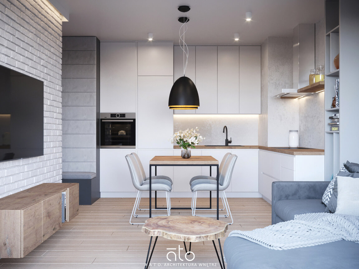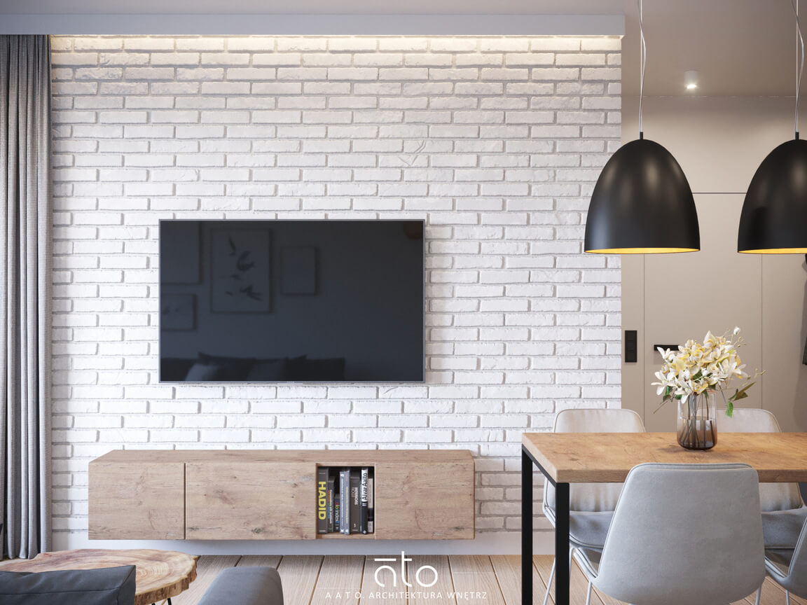 Przytulne mieszkanie z dużym aneksem kuchennym i centralnie umiejscowionym stołem będącym sercem mieszkania. Uwagę przykuwają dekoracyjne lampy nad stołem. W sypialni pojemna szafa na całą szerokość pokoju z lustrzanymi frontami powiększającymi przestrzeń.
