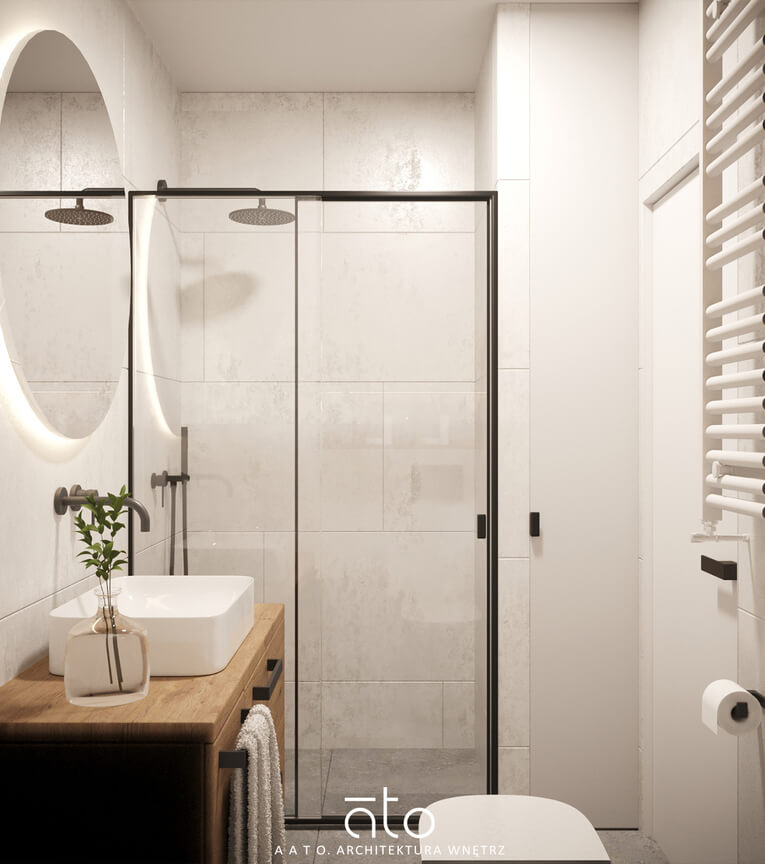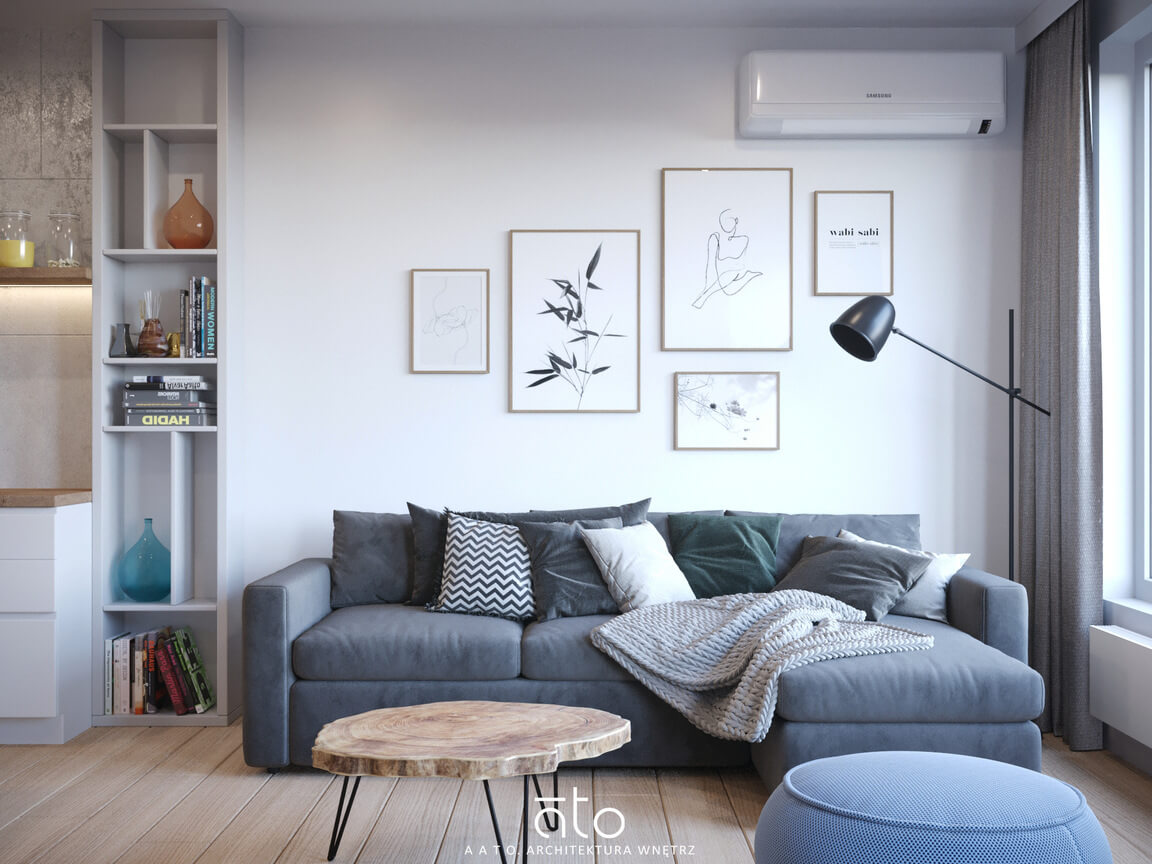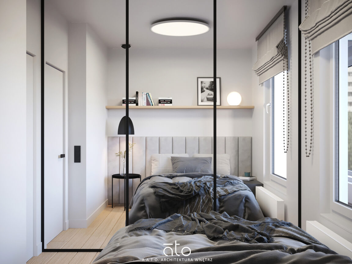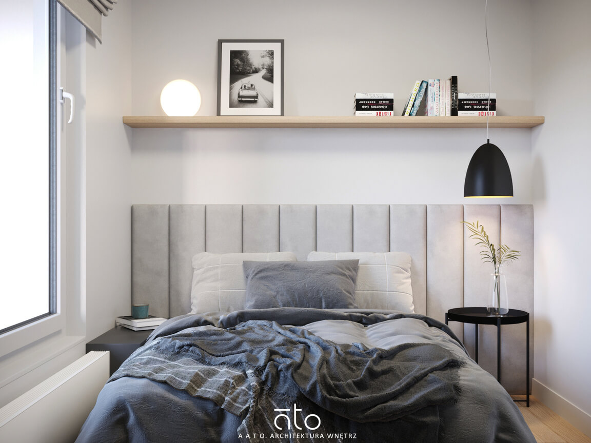 Przytulne mieszkanie z dużym aneksem kuchennym i centralnie umiejscowionym stołem będącym sercem mieszkania. Uwagę przykuwają dekoracyjne lampy nad stołem. W sypialni pojemna szafa na całą szerokość pokoju z lustrzanymi frontami powiększającymi przestrzeń.